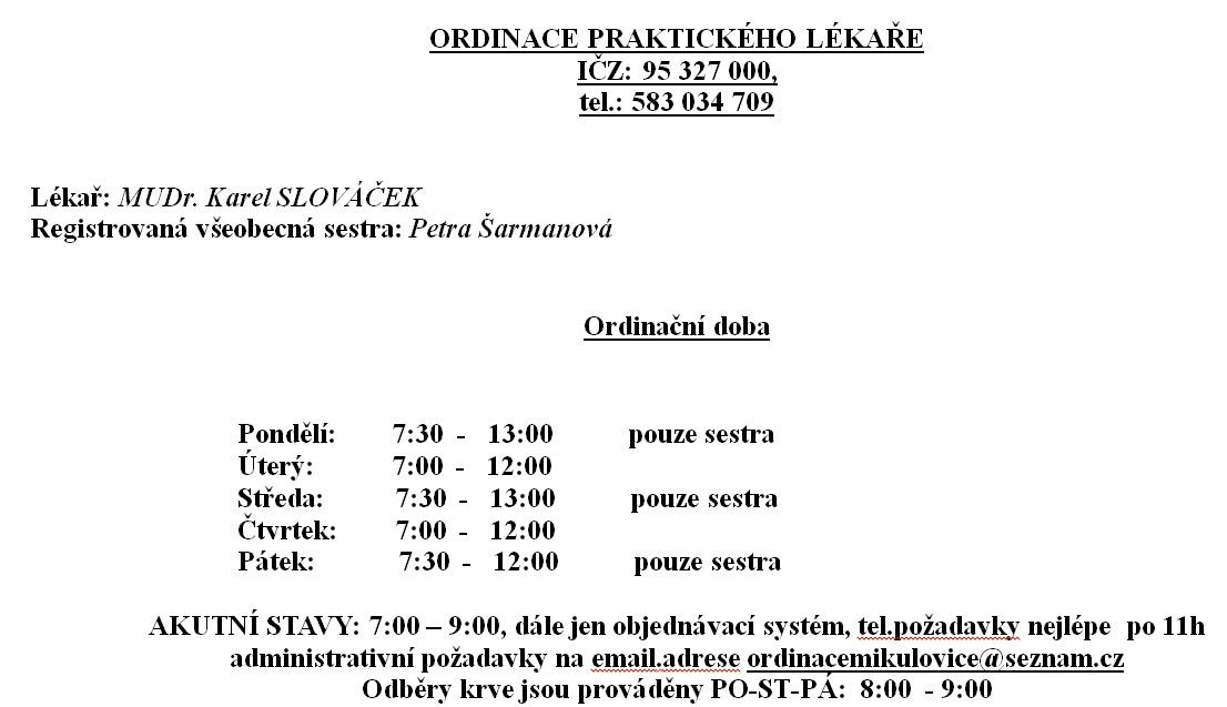 Ordinace MUDr. Slováčka - ordinační hodiny