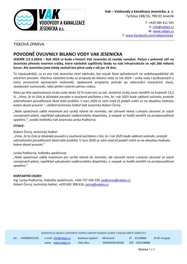 Povodně ovlivnily bilanci vody VAK Jesenicka