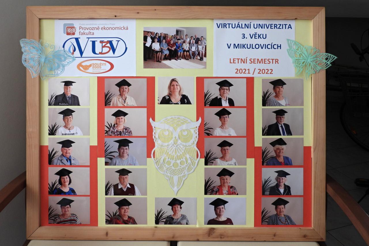 V Praze proběhla promoce studentů Virtuální univerzity studentů třetího věku. Ve vestibulu OÚ můžete shlédnout tablo studentů s tutorkou Štěpánkou Beníčkovou, ředitelkou Soužití 2005, o. p. s.